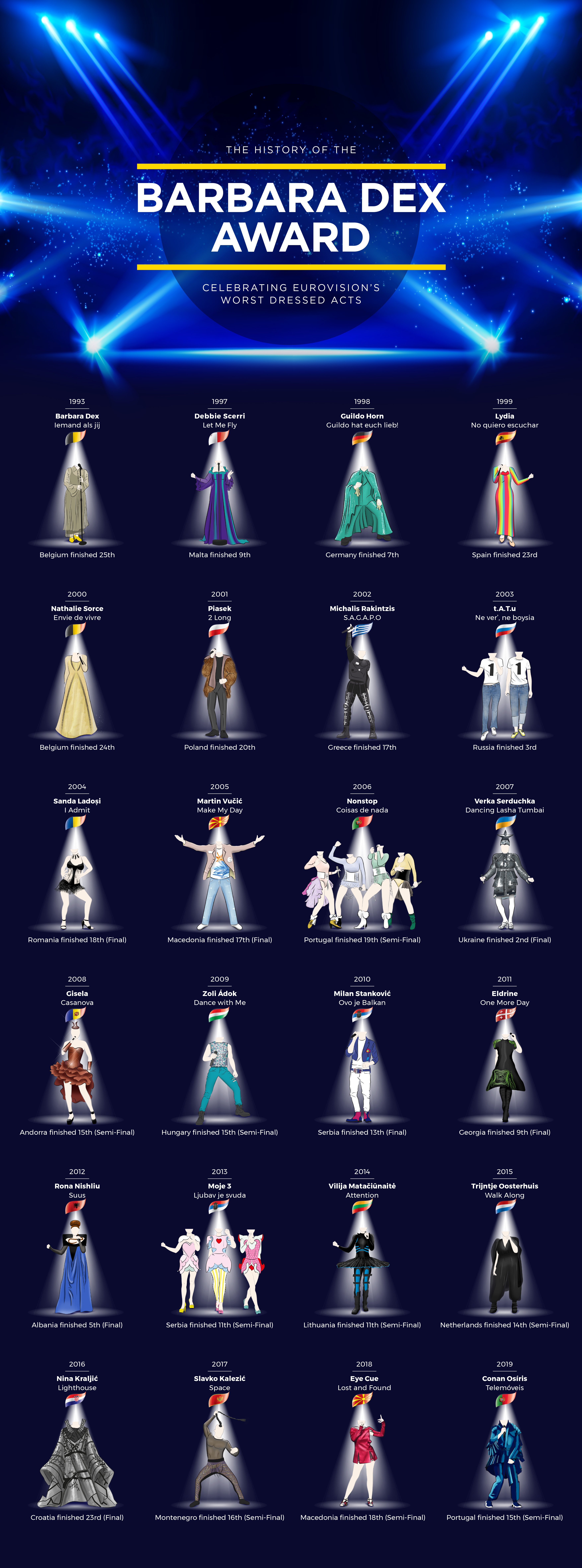 <a href="https://www.dresscode.nl/barbara-dex-awards/"><img src="https://www.dresscode.nl/content/uploads/2021/05/Barbara-Dex-Award-Infographic-Eurovision2020.jpg" alt="Infographic Barbara Dex Awards"> </a> <br/><a href="https://www.dresscode.nl/barbara-dex-awards/"> Infographic Barbara Dex Awards</a> door dresscode.nl