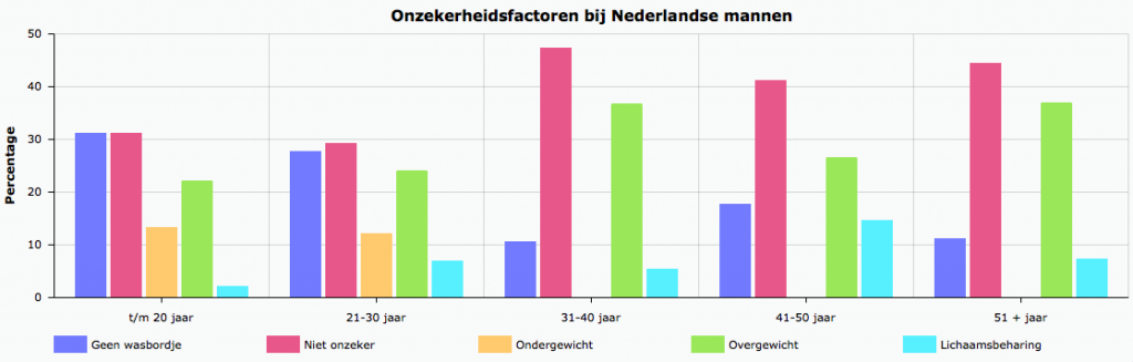 Mannen uit de leeftijdsgroep 31-40 lijken het meest positief over zichzelf. Bijna de helft van de mannen in deze leeftijdscategorie (47,4%) geeft aan dat ze tevreden zijn met hun uiterlijk. Opvallend is dat het niet hebben van een wasbordje vooral onder de jongeren een reden is voor onzekerheid. Bij de categorie tot en met 20 jaar geeft 31,1% aan dat dit hen onzeker maakt op het strand.
